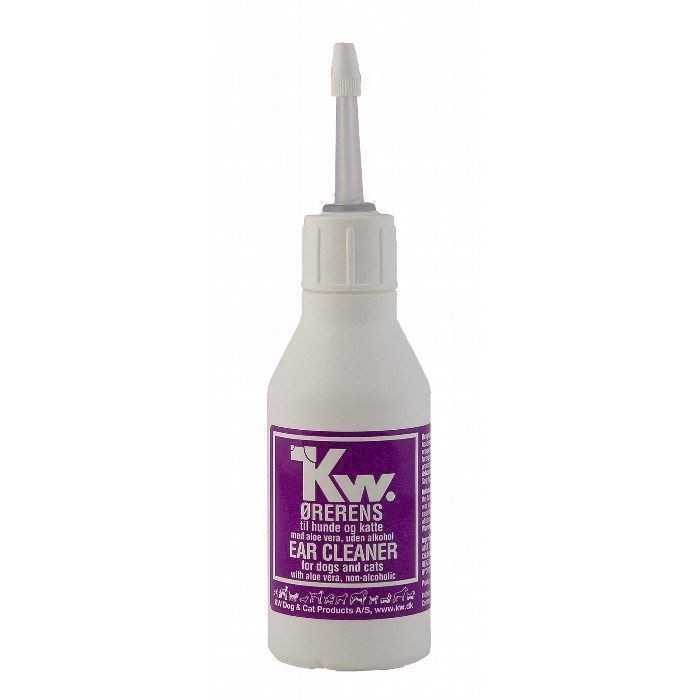 Beskrivelse. – Til hunde og katte med følsomme ører. – Løsner ørevoks uden, at svie eller også irritere. Brugsanvisning.- Dryp 5-10 dråber KW ØRERENS i øregangen. Og masser forsigtigt basisøret efter behov. – Drej hovedet lidt på skrå og masser det lø