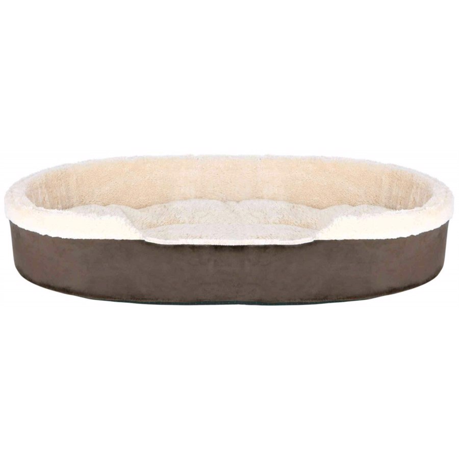 Beskrivelse. – Korthåret blødt plys. – Polyester Betræk. – Med skumfyld. – Med vendbar pude i 2 design versioner. – Pude med polyester fyld. – Med skridsikker bund. – Oval hundeseng med høje kanter. Farve. BrunBeigeVask.Sengen kan hånd