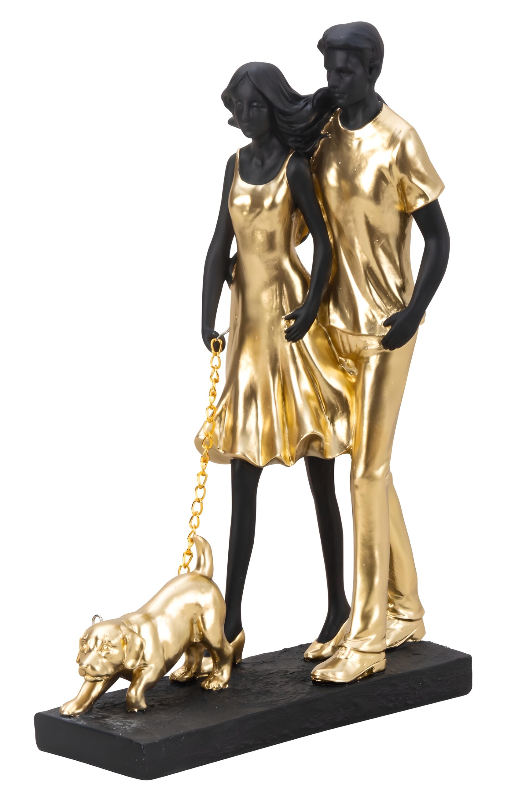Elegant figur af par med hund er en fantastisk tilføjelse til din indretning. Denne stilfulde dekoration bringer charme og personlighed ind i ethvert rum. Fremstillet af holdbart polyresin. Sikrer den langvarig skønhed og modstandsdygtighed. Designet kombinerer moderne linjer med elegante nuancer af guld og sort. Hvilket giver et iøjnefaldende udtryk.