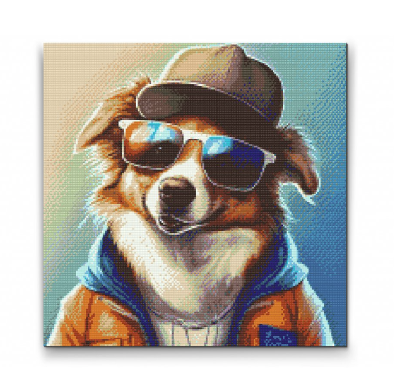 Det flotteste diamond art-billede af en cool hund med fede briller på. Billedet er fra vores Premium Diamond Art Serie. Der er kendetegnet ved ekstra god kvalitet og særlige egenskaber. F. Eks. Er farverne trukket ud over kanterne., Så det ikke er nødven