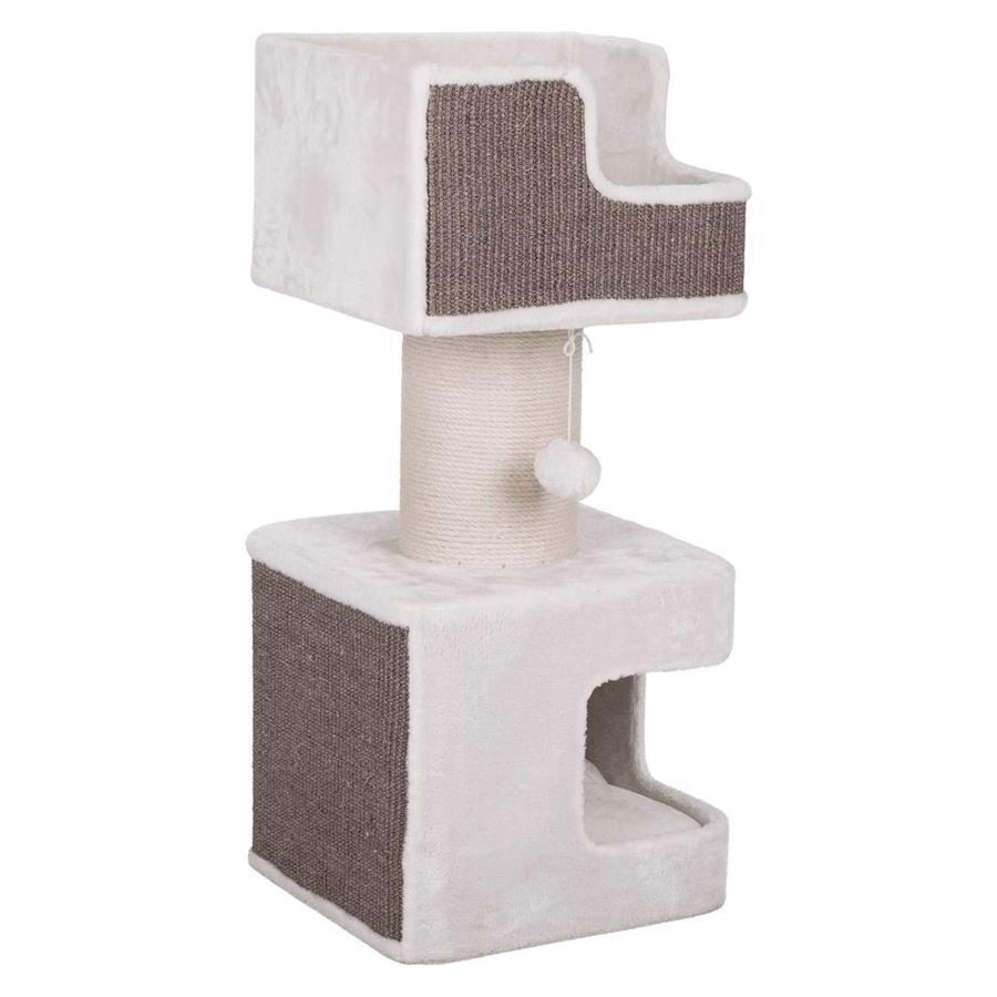 Beskrivelse. – Med plysbetræk og sisal ridseroverflade. – Stamme indpakket i jute. – Hule udstyret med plys. – 2 venbare puder. – Med legetøj på snorStørrelse. Gulvområde. 39 x 39 cmStamme. Ø 18 cmHøjde. 86 cmFarve. HvidGrå