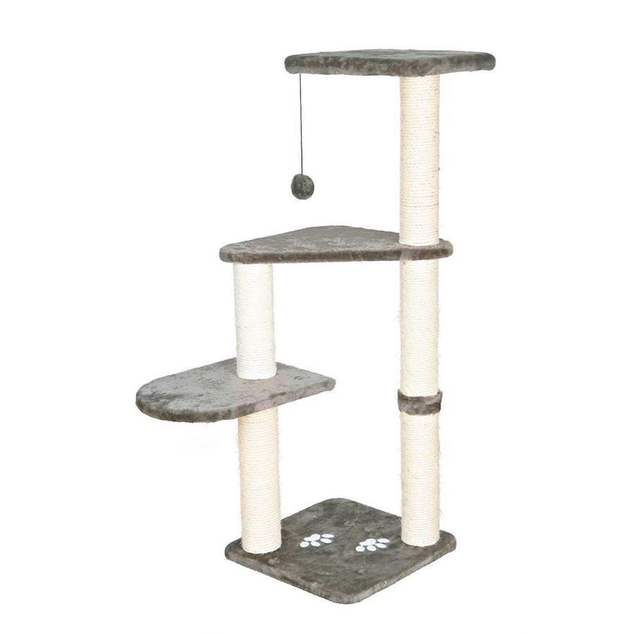 Beskrivelse. – Med plysbetræk. – Stammer indpakket i naturlig sisal. – Polstrede platforme. – Legetøj på snorStørrelse. Gulvområde. 40 x 40 cmStamme. Ø 9 cmHøjde. 117 cmFarve. Platin grå