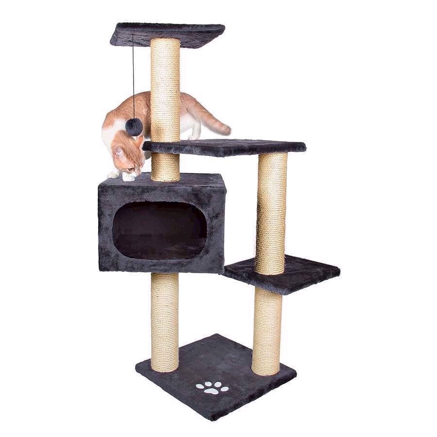 Kattemiljø med tre plateauer på forskellige højder og en hyggelig hule. Stammerne er klædt med naturlig sisal. Hvor katten kan hvæsse kløer. Gulvpladen. Hulen og plateauerne er klædt med plys, så der er behageligt for katten, at ligge og slappe af. Fra den