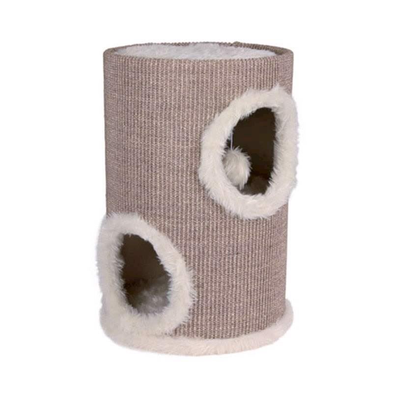 Beskrivelse.- 2 etager- 2 huller i siden af tårnet- Langhåret plys rundt de to huller og inden i tårnet. – Sisal rundt hele tårnet. – Platform polstret med langhåret plys- En bold på elastikbånd inden i tårnetFarve.Brun og beigeStørre