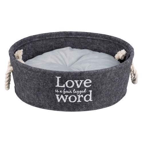 Beskrivelse. – Lavet i filt polyester. – En formstabil seng med forstærket kant. – Isolerende og smudsafvisende. – Med pude med plysbetræk og polyesterfleecefyld. Sengen er quiltet med dekorative håndtag af snoet bomuldstov. Størrelse. Sma