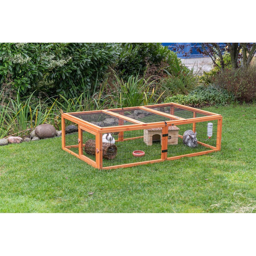 Kaningård med 2 små sidedøre. Samt en aftagelig dør til placering af et natura gnaverhusLåg kan åbnes i begge siderTrådgitter af metal. PulverlakeretFyrretræStørrelse.- 174 x 109 cm og 48 cm højt