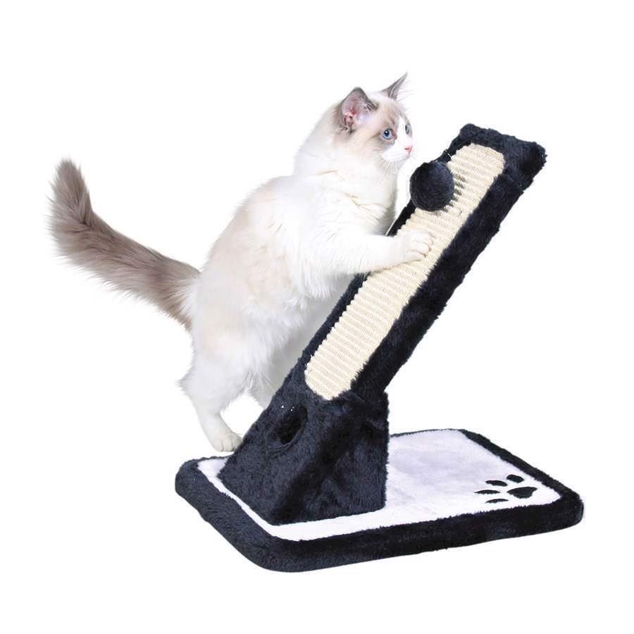 Dette kradsebræt er sat på skrå og der er legetøj på toppen og i bunden for, at invitere til leg. Hele pladen er klædt med plys. Sort i kanten og beige på overfladen. Med en sort pote i det ene hjørne. Farve. Sisal. Sort og beige plysStørrelse.