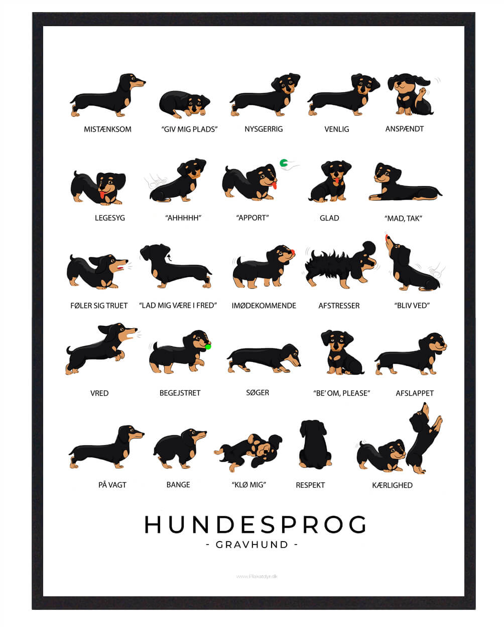 Gravhund Hundesprog Plakat Opdag din gravhunds unikke kropssprog med denne detaljerede plakat fra Plakatdyr. Dk. Plakaten illustrerer. Hvordan gravhunde bruger deres krop til, at udtrykke følelser. Behov og humør. Med fokus på halepositioner. Ører. Ansigts