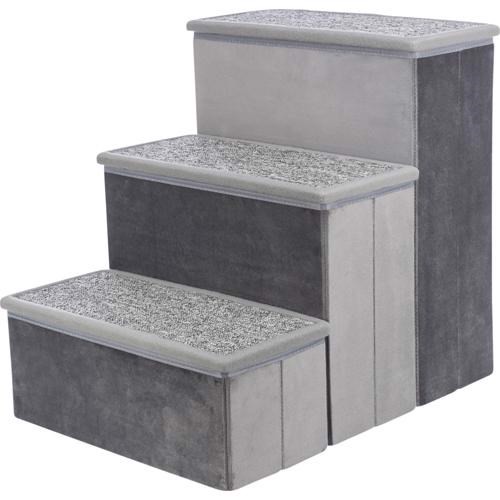 Beskrivelse.- Trapper med opbevaringsplads. – I fløjl polyester- Tæppebeklædte trin for sikkert fodfæste til hunden eller også katten- Med opbevaringsplads i trinnene. Som kan åbnes. – Sammenklappelig trappe. – Op til 50 kgFarve. GråStørre